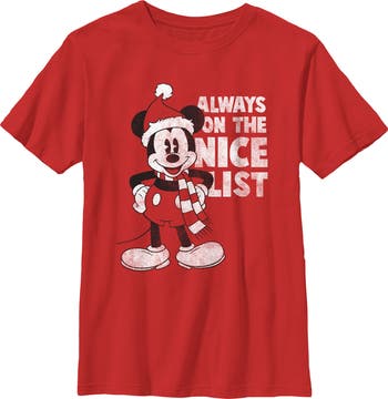 - Strut your stuff with this stylish new boys' t-shirt that is perfect for the festive holiday season! Featuring a distressed graphic of Mickey Mouse in a Santa hat alongside the phrase: "Always on the Nice List" in white lettering.
