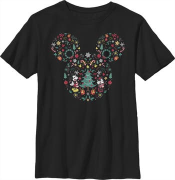 - Strut your stuff with this stylish new Christmas Boys' T-Shirt that is perfect for the holidays! Featuring a Mickey Logo filled with your favorite characters, including Mickey and Minnie Mouse, and Christmas ornaments, gifts, candies, hollies, snowflakes, and more!