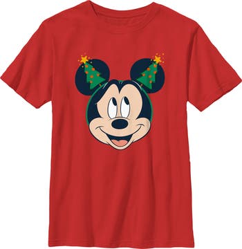 - Strut your stuff with this stylish new Christmas boys' t-shirt that is perfect for the holiday season! Featuring Mickey smiling and wearing a headband with two Christmas trees across the front.