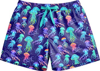 Crafted from sustainable recycled polyester, these board shorts feature a striking navy jellyfish design with vibrant multicolor accents and a contrasting drawstring closure. The integrated mesh lining provides breathable comfort, making them an ideal choice for extended water activities and warm-weather exploration.