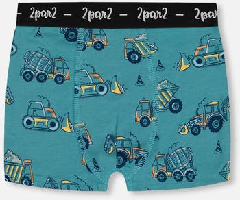 Our Printed Organic Cotton Boxer Shorts Teal with Yellow Trucks are equal parts comfy and cute! Super soft in stretch cotton, this short features a playful allover truck print and a logo elastic waistband for a touch of signature style.