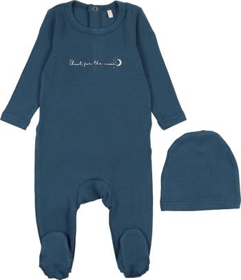 The Shoot for the Moon Footie in Royal Blue offers a perfect fit with just the right amount of stretch for all-day comfort. Its rich blue color pops with playful charm, and it comes with a matching hat to complete the look. Soft, cozy fabric makes this set ideal for little dreamers ready to explore!