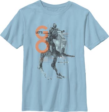 - Protect the galaxy with this boys' t-shirt that will look perfect alongside the New Republic! Featuring The Mandalorian on an AT-RT and the text "Let's Go" printed across the front.