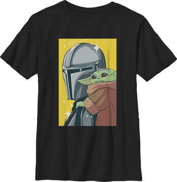 - Protect the galaxy with this boys' t-shirt that will look perfect alongside the New Republic! Featuring a cute graphic of Grogu holding onto Din Djarin's shoulder on the front.