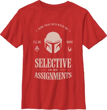 - Protect the galaxy with this boys' t-shirt that will look perfect alongside the New Republic! Featuring The Mandalorian's helmet and the text "No That He's With Me, I'll Be More Selective In My Assignments" printed across the front.