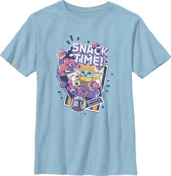 - Experience the thrill of the galaxy with this new boys' t-shirt that is perfect for fans who know that "this is the way" to stay stylish! Featuring Grogu enjoying space popcorn with the statement "Snack Time!" printed above and a small photo of The Mandalorian at the bottom.