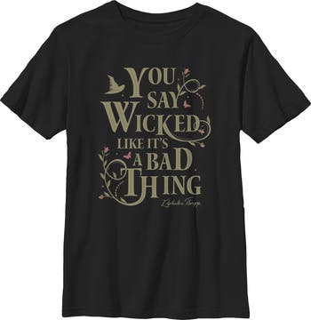 - Real style and friendship are truly unlimited with this new boys' t-shirt that is perfect for whenever you're feeling a little defiant! Featuring Elphaba's iconic phrase, "You Say Wicked Like It's a Bad Thing," adorned with flowers and butterflies across the front.