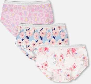 This pack of three boyshort panties brings together fun prints and everyday comfort. One panty features a playful purple leopard pattern, another is covered in cheerful pink smiling flowers on a blue background, and the third shows delicate blossoms on a pale pink base. Made with soft organic cotton and a touch of stretch, this set is designed to move with her all day long.