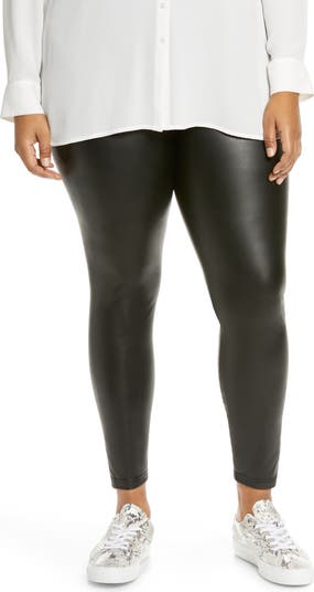 These slick faux-leather leggings boost your cool-girl style and amp up your curves thanks to their wide, smooth waistband.