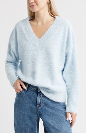 A supersoft eyelash-knit texture and slouchy dropped shoulders amp up the cozy-cool vibe of this lightweight sweater you can layer or style solo.