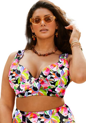 Meet one of the most supportive and glamorous tops around. Sized to offer you a personalized fit based on your actual bra size with molded cups to help lift and shape your bust. Shirring and side boning provide extra support. Fashion details include a gathered front overlay softly draped across the bust and square Lucite rings. Adjustable back straps and a G-hook closure let you customize the fit.