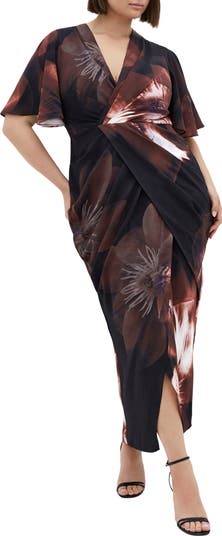 A floral print brings a hint of romance to this curve-skimming maxi dress designed with a surplice neckline and short sleeves. Front draping shapes the silhouette, while a tulip skirt adds a touch of allure.