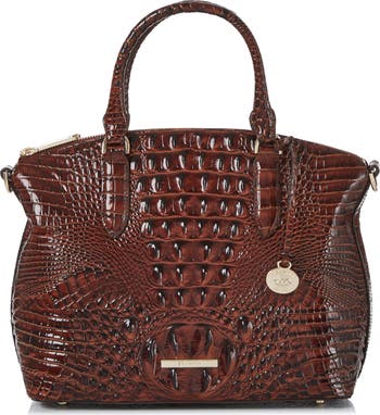 With its glossy, croc-embossed leather exterior and structured, slightly domed silhouette, this satchel is the last word in classic elegance. Rolled top handles, an optional crossbody strap and signature Brahmin touches—including a light-colored lining, convenient pen loops and a key clip—add to the bag's versatility. Gleaming goldtone hardware provides a last bit of polish.