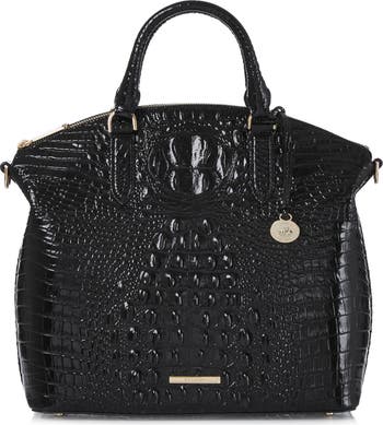 Glazed, croc-embossed leather and gleaming hardware elevate the sophisticated look of a domed satchel with a slightly slouched silhouette and generous size. Signature Brahmin touches—including a light-colored lining, pen loops and a key clip—add to the bag's versatility.