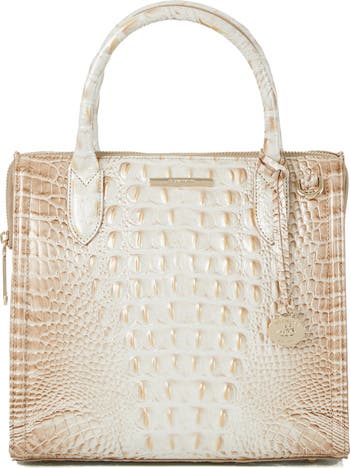 Croc-embossed leather and gleaming hardware elevate the sophisticated appeal of a compact satchel styled with ample pockets to keep essentials organized.