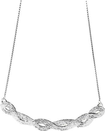- The Braid Necklace is an undulating, textured, and braided pendant masterfully crafted from reflective metals! This statement piece is formed from cotton threads for a unique look. Make a bold statement and show off your individual sense of fashion with this textile-inpired piece! I Hangs at the collarbone from 14 in of sterling silver box chain