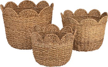 Braided Bankuan and Rattan Baskets with Scalloped Edge, Natural, Set of 3