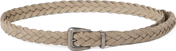 The woven design of the belt is made with refined calfskin leather, characterized by a rich, even grain.