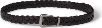 The woven design of the belt is made with refined calfskin leather, characterized by a rich, even grain.