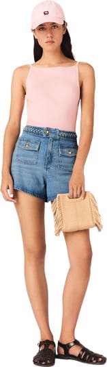 Sun-drenched elegance inspires a wardrobe where craftsmanship and a sense of detail come together to enhance the free-spirited look of the Maje woman.These faded blue denim shorts play on contrasting materials, with a signature braided belt and light-catching gold buttons. Their slightly flared cut structures the silhouette, while the large patch pockets and impeccable finishes make them a piece that is both casual and sophisticated.Pair them with a pale pink fitted tank top and flat sandals for a fresh look, and complete the look with a raffia M mini bag to accentuate the summer feel.