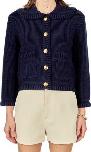 Braided trim adds texture and dimension to this cardigan made with high-shine buttons and a charming collar.