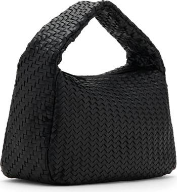 Intricately braided faux leather brings movement and dimension to a scaled-down bag featuring a voluminous profile and suspended from a wide top handle.