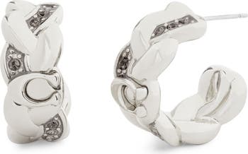 These braided, textured hoop earrings feature an open hoop silhouette with a signature sculpted C motif in front and minimal stones for a sparkly touch.
