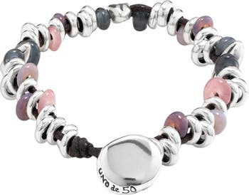 This sterling silver-plated bracelet combines rustic leather with polished beads, blending relaxed style with handmade character.