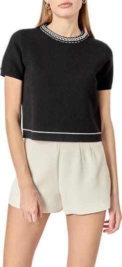 An intricate braided design at the neckline add intriguing texture to this boxy knit top that doubles as both an elegant and casual piece.