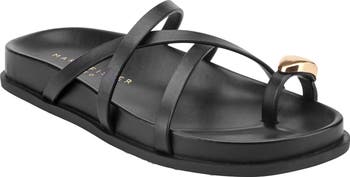 Slim sculpted straps and goldtone toe detail modernize the silhouette of this sleek sandal designed to make an eye-catching touch to any look.