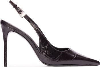 Pointy toe sling back pump, set on stiletto pin heel. Made with print croc leather.