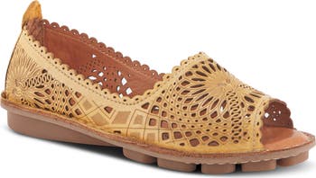 Dainty cutouts enhance the summery style and breathable, flexible fit of a peep-toe sandal complete with scalloped edges.