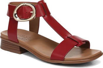 A geometric buckle and wide T-strap bring distinct elements to a leather sandal featuring Contour+ Comfort technology and a flexible sole for optimal comfort and stability.