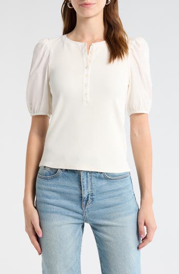 Shake up your casual-cool wardrobe with this button-up boasting adorably puffed sleeves and a half placket for a minimalist aesthetic.
