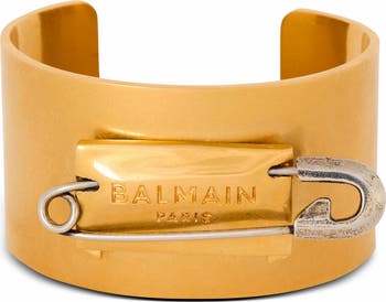 Brass and metal safety pin bracelet Silver metal safety pin Engraved Balmain Paris plaque in gold brass Cuff design Balmain Paris logo engraved inside Main material: 70% brass 20% copper 10% zamac Made in Italy Item: EN4XH423MBPO