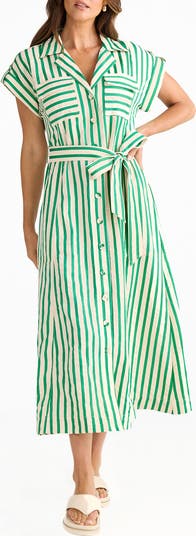 The classic stripes lead to a pretty and polished destination for this textural shirtdress cut to a versatile maxi length and defined at the waist with a tie belt.