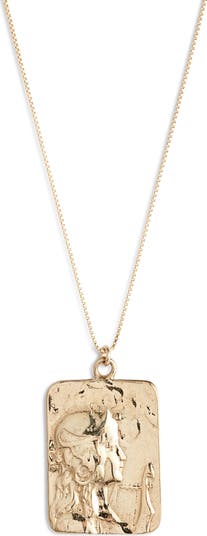 A vintage-look bas-relief pendant brings old-world charm to this gold-plated necklace with powerful shine.