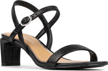 Embossed leather flaunts a metallic glimmer on a minimalist two-peice sandal featuring a foam-cushioned footbed and modest block heel for walkable comfort.