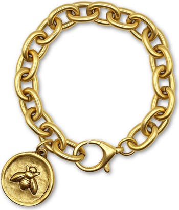 The Brea Bracelet is a standout piece. Featuring our signature chunky Blair chain, this bracelet is adorned with a double-sided bee charm, adding a touch of whimsy, strength, and symbolism to your stack. Designed for those who lead with confidence and aren't afraid to make a statement. Handle With Care: To preserve the shine and finish of your statement jewelry, avoid water, sweat, and direct contact with lotions or perfumes. Remove before showering, swimming, or working out. 12k Gold Plated Blair Chain 12k Gold Plated Double Sided Charm Small/Medium (7.5") | Medium/Large (8") Clasp Attaches to Any Link Listing Is For One Bracelet