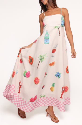 A bright, bubbly and summery print adds just the right touch of charming visual appeal to this woven dress hung from slender straps and cut in an A-line silhouette.