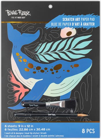 SCRATCH ART: PAPER PAD - COASTAL & OCEANIC - Bring the beauty of the ocean to life with the Brea Reese 9x12 Scratch Art Pad – Coastal. This captivating scratch art set features six bold oceanic designs, including a majestic whale, graceful sea turtle, detailed crab, elegant seahorse, delicate shells, and flowing seaweed—all set against a bold black background. Simply use the included wooden stylus to scratch away the surface and reveal brilliant rainbow colors and shimmering metallic highlights hidden beneath. Each stroke transforms the dark outline into a vibrant underwater masterpiece filled with depth, contrast, and eye-catching detail. The pad includes six premium 9" x 12" scratch art sheets (one of each coastal design), a wooden stylus for precise lines and fine details, and a brush to easily sweep away scratch dust—everything you need to start creating right out of the package. Pre-printed guidelines make it easy for beginners to achieve stunning results, while the intricate artwork keeps the experience engaging and relaxing for more advanced artists. Perfect for teens, adults, and ocean lovers alike, this screen-free creative activity offers a calming escape into seaside beauty. Frame your finished pieces to add a splash of coastal charm to your home décor or gift a handmade work of art inspired by the sea.