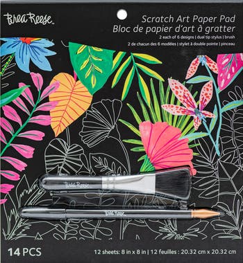 BREA REESE: SCRATCH ART PAPER PAD - TROPICAL - Unleash your creativity with the Brea Reese: Scratch Art Paper Pad - Tropical. This kit features 12 stunning designs of ethereal flowers with shimmering metallic touches, ideal for a guided art experience everyone can enjoy. The 8x8 perforated paper tears out easily, making it convenient to work on your masterpiece anywhere. With a brush and dual-sided scrapers included, crafting intricate patterns has never been easier. Each illustrated design boasts pops of color and metallic elements, which come to life as you uncover the hidden beauty beneath the surface. Once completed, these artworks are perfect for framing and instantly add a touch of elegance to your home decor. Whether you're looking for a mindful relaxation activity or a fun DIY decor project, the Brea Reese: Scratch Art Paper Pad - Tropical is the perfect choice. Get yours today and let your imagination run wild with these mesmerizing floral creations. Includes: 1 Scratch Art Paper Pad, 1 Brush, 1 Stylus