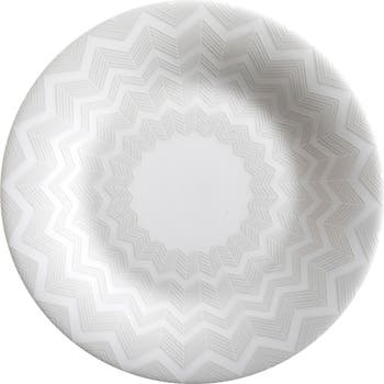The Missoni Zig Zag collection is a homage to the iconic zigzag stitches that made Missoni's designs instantly recognizable and elevated the brand to global luxury status in the 1960s. Multicolored or self-patterned white, the Zig Zag line is a best-selling line. The range includes dinnerware, flatware, glassware, trays, and scented candles.