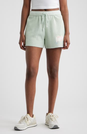 Pretty pastel logo graphics stamp these waffle-knit shorts sporting raw hems for a laid-back vibe.