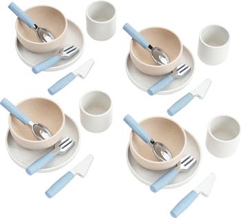 18 months & up. Set the table and prepare for some pretend play fun with this complete tableware set for play kitchens. Young children can explore mealtime routines, socialize, and build early skills using the durable, easy-to-clean pieces in this set. Includes 4 plates, 4 bowls, 4 mugs, 4 spoons, 4 forks, and 4 knives.