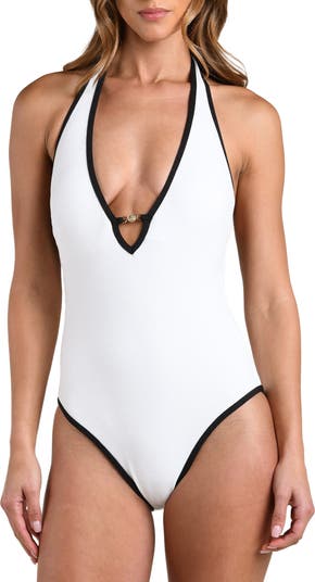 Gleaming hardware details the front of this one-piece fashioned with a removable strap at the low-dipped back.