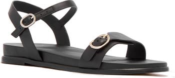 Buckled straps and a smooth leather upper distinguish a minimalist two-piece sandal featuring a podiatrist-designed footbed that offers targeted arch support and promotes better alignment.