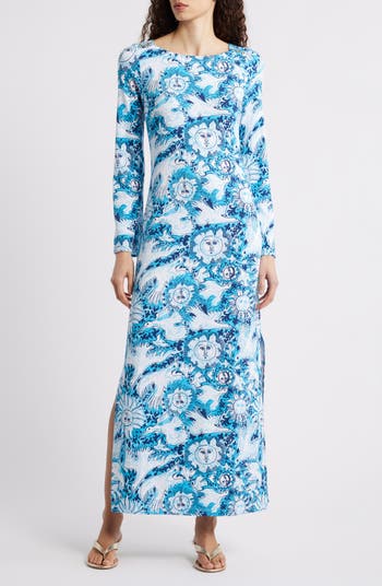 A bateau neckline with button-trimmed shoulders defines this figure-skimming maxi dress finished in a coastal seagull print and built-in UPF 50+ sun protection for easy resort days.