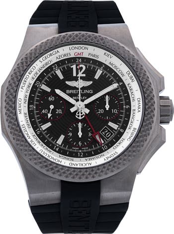 Another classic from the aviators' go-to watchmaker, this 2020 preowned Bentley GMT chronograph features a readable design inspired by the layout of aircraft gauges and the added functionality of tracking time in two regions thanks to a fourth hand and a bidirectional rotating bezel labeled with a major city per time zone. Titanium construction keeps this feature-loaded watch lightweight and comfortable to wear, while the rubber strap furthers the industrial aesthetic and overall durablilty of the piece.