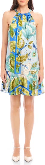 A ruffled hem and a shift silhouette bring swingy movement to this dress designed in a vivid print and framed by sleek cutaway shoulders.